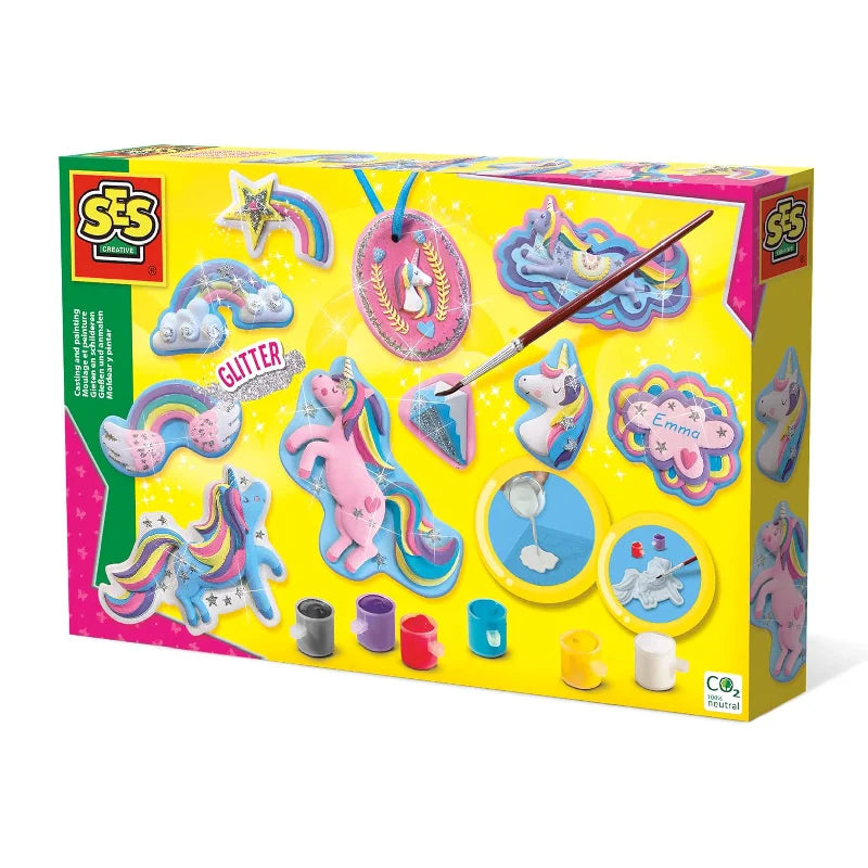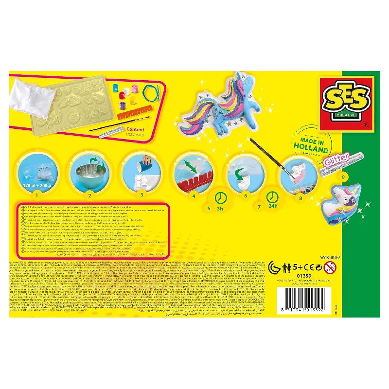 Das SES Creative 01359 Gießen und anmalen Einhörner-Set begeistert Kinder ab 5 Jahren mit kreativem Bastelspaß. Die Gipsformen werden gefüllt, ausgehärtet und anschließend individuell mit sechs trendigen Farben bemalt. Glitzerelemente ermöglichen zusätzlich einzigartige, funkelnde Verzierungen. Eine verständliche Anleitung führt durch alle Schritte, wodurch auch Anfänger sichere Ergebnisse erzielen. Dieses Set fördert sowohl die Feinmotorik als auch die Fantasie und erlaubt das Gestalten persönlicher Kunstwerke.